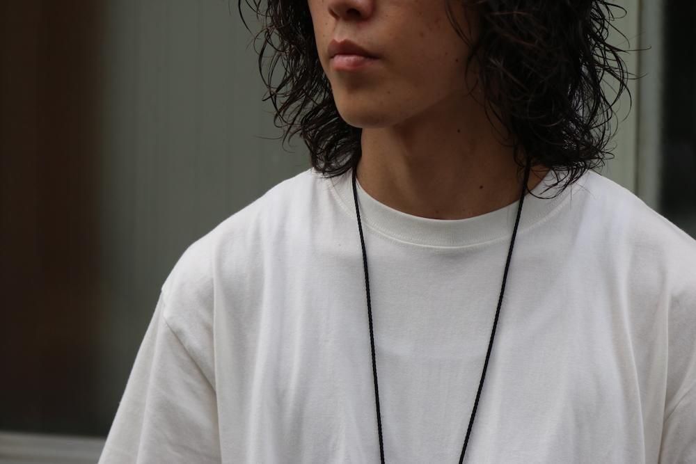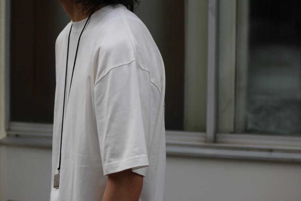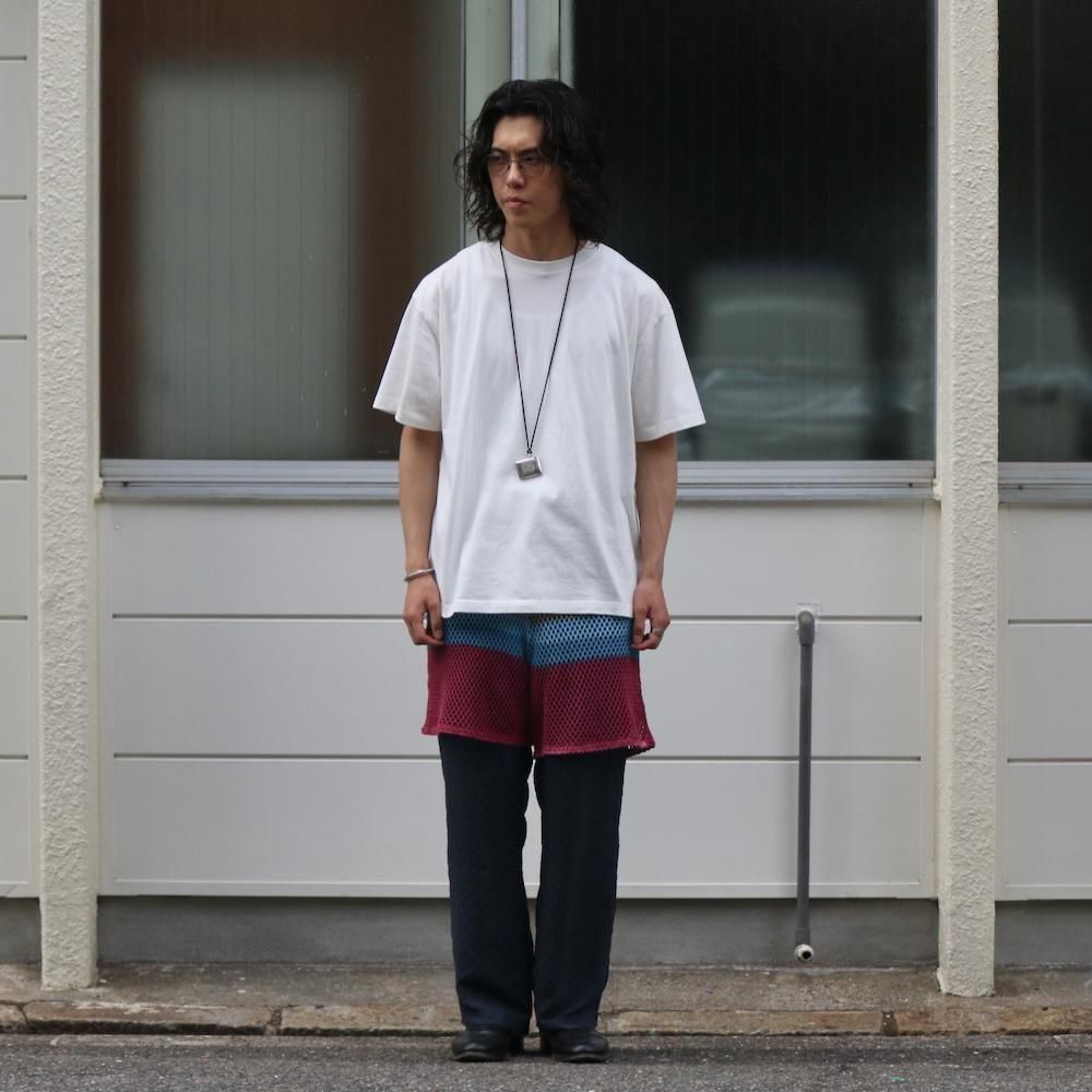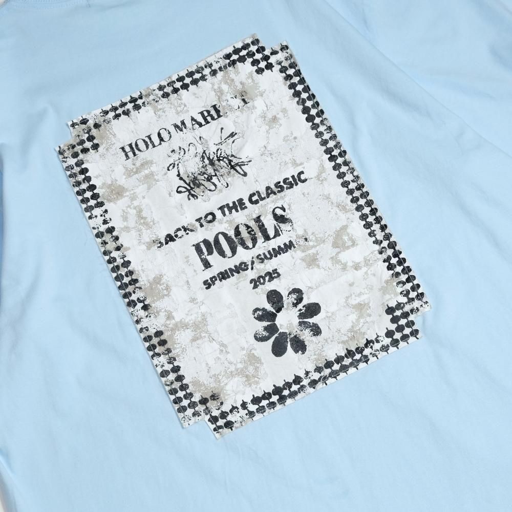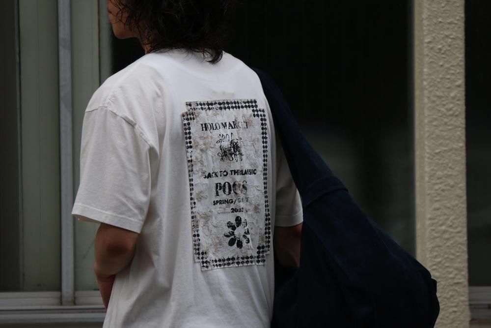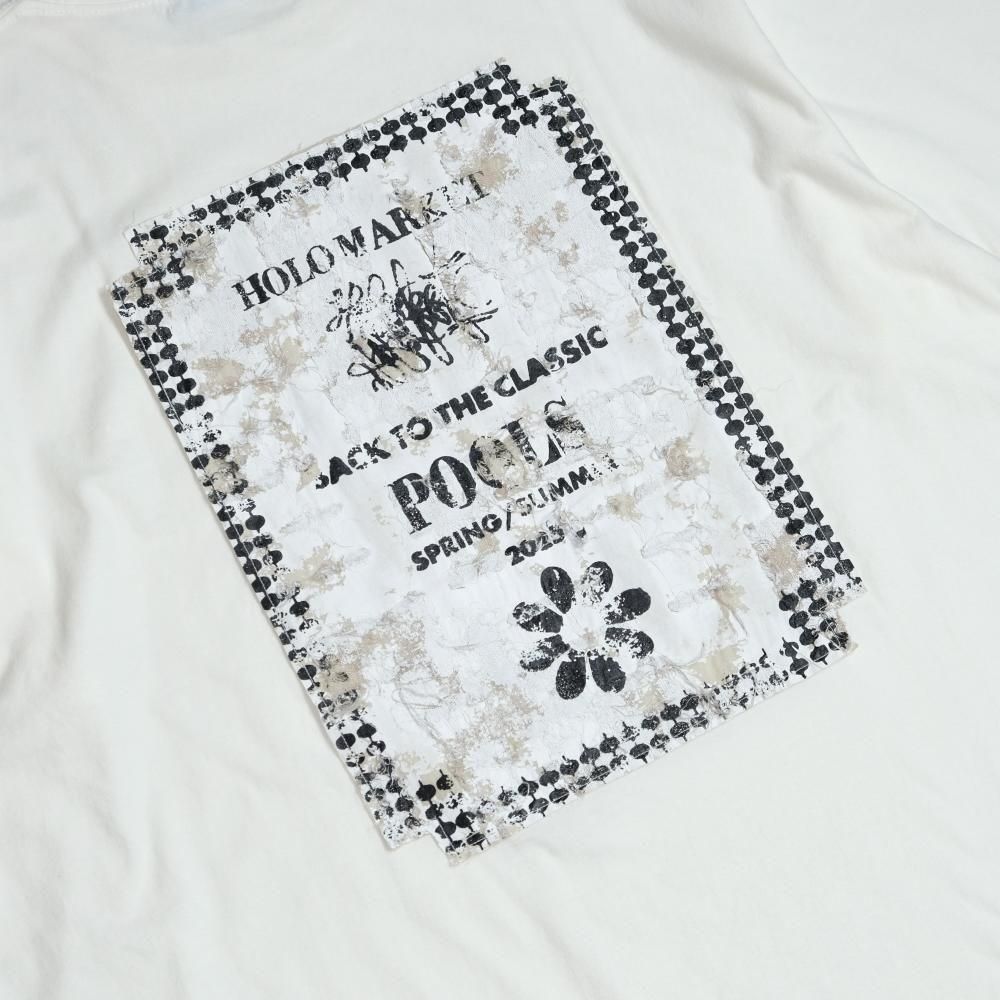 背面にシーズンテーマのPOOLSのタイルをイメージしたパッチが施されております。パッチはコットンにガーゼを貼り付けたものにオパールを施し、ダメージ加工を行ったのちに白顔料でムラコーティングを施しております。シルエットは身幅にゆとりを持たせたボックスシルエット。一枚着としても大変インパクトのあるアイテムです。