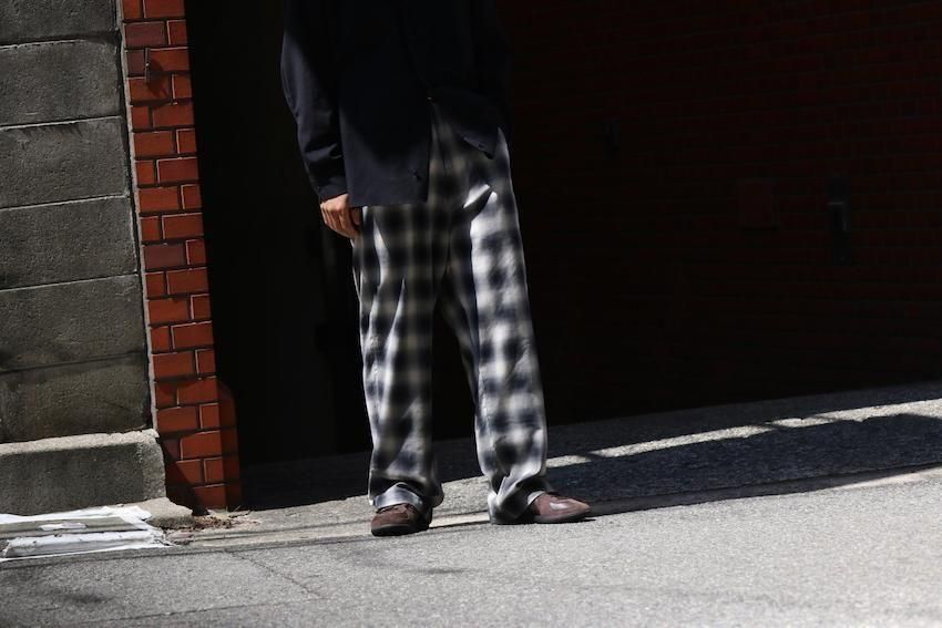 オーソドックスなオンブレチェックながらも、ヤクをブレンドすることで素材感に奥行きと光沢感が生まれることで、上品な仕上がりとなっております。また、余白がありながらも、裾に向かっていくラインが綺麗な仕上がりのシルエットで、ウエスト周りはゴムとベルトループも併設しており、シーンに応じて使い分けることが出来るのも特徴の一つです。ブランド定番のシルエットを上品な印象のカジュアルウェアとして、幅広い用途で使用できるイージータイプのトラウザーです。