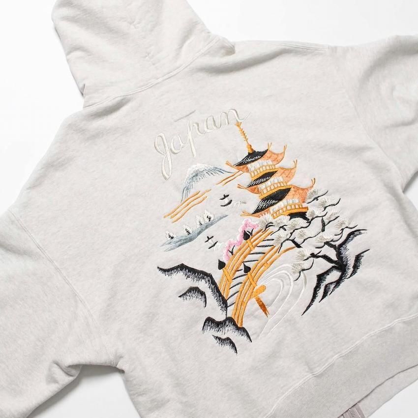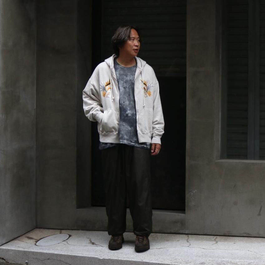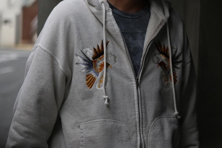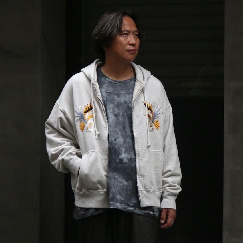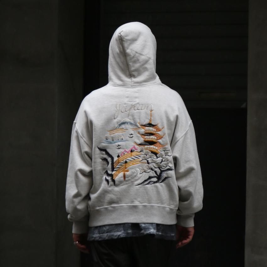 日本を訪れたUSARMYの兵士が、日本でスカジャンを売る刺繍スーベニア屋さんで、自分のもつジップパーカに刺繍を頼んだ物語で製作。ビンテージに見られるオールドディテールを踏襲しつつ、90年代フィットに仕立てたオールシーズン対応の肉厚スウェットは、特別なビンテージ感を醸し出し、他にはない雰囲気を演出します。
