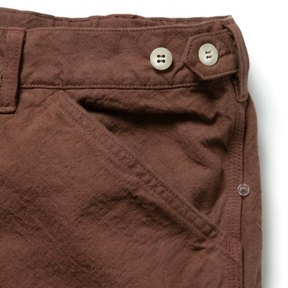 1980年代の某ワークウェアブランドのペインターパンツをベースに、デザインしたアイテム。ステッチワークには3本針ステッチを採⽤し、無⾻でクラシックな印象を残しつつも、ウエスト部分にはタブとゴムを組み合わせた仕様を追加し、ベルト無しでもサイズ調整が可能な仕様にデザイン。また前開きはボタンフライ仕様に変更し、リラックス感のあるアイテムに仕上げています。素材には10オックスのオーガニックコットンを使⽤し、軽量で動きやすいアイテムに仕上がっています。洗いざらし感や加⼯感が際⽴つ素材を選定しているため、表情豊かなアイテムに仕上がっています。BROWNは柿渋、SUMIKUROは備⻑炭から染料を抽出しボタニカルハイブリッド染を施した、今シーズンオススメの1本です。