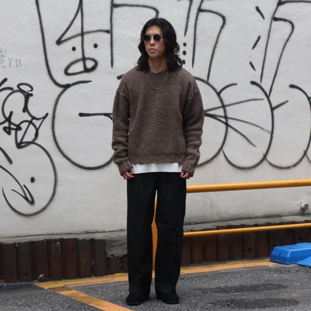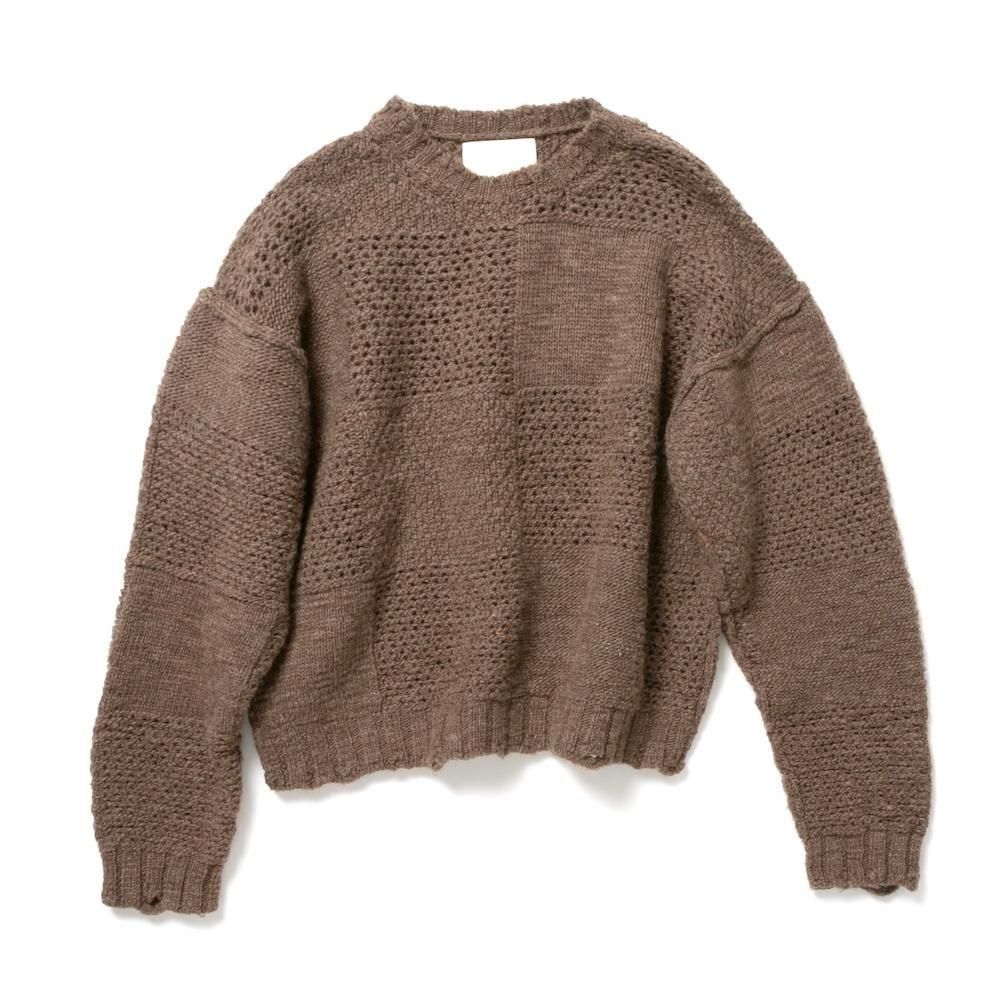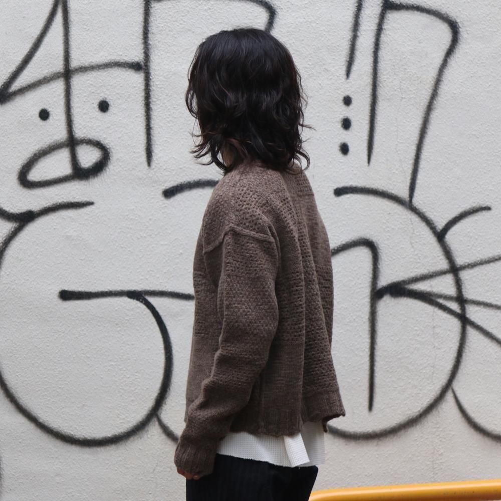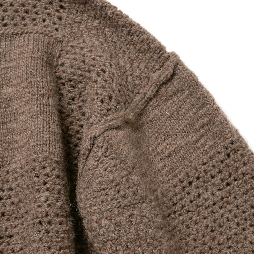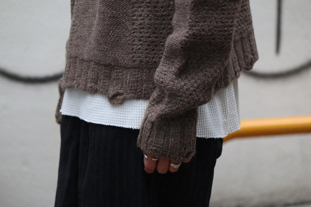 各編み地が織りなす独特のテクスチャーと、肩接ぎや袖接ぎ、脇接ぎといった接ぎ目部分をあえて表側に出しリンキングしているため、表裏ひっくり返したようなデザインになっています。袖口や裾にダメージ加工を加えることで、着古した表情のあるアイテムに仕上げられています。 素材には、ウルグアイ産の天然色の羊毛スラブヤーンを採用。染料や助剤を一切使用せず、羊毛そのもののナチュラルな色合いや風合いなど魅力を最大限に活かした素材です。