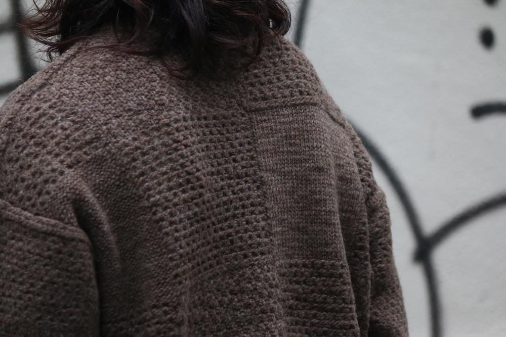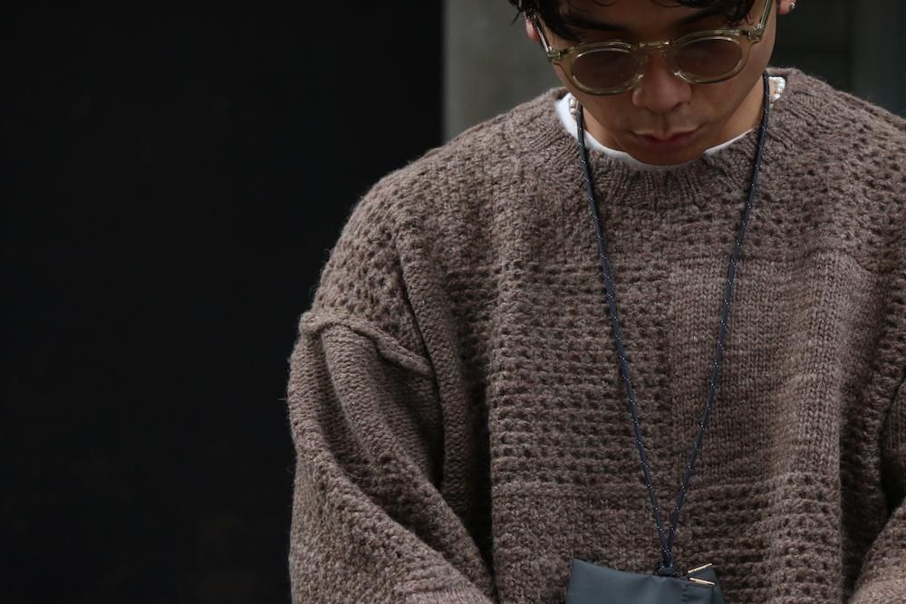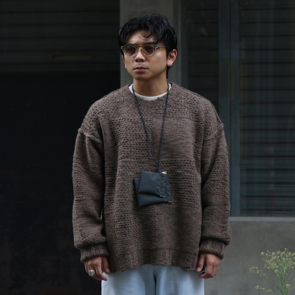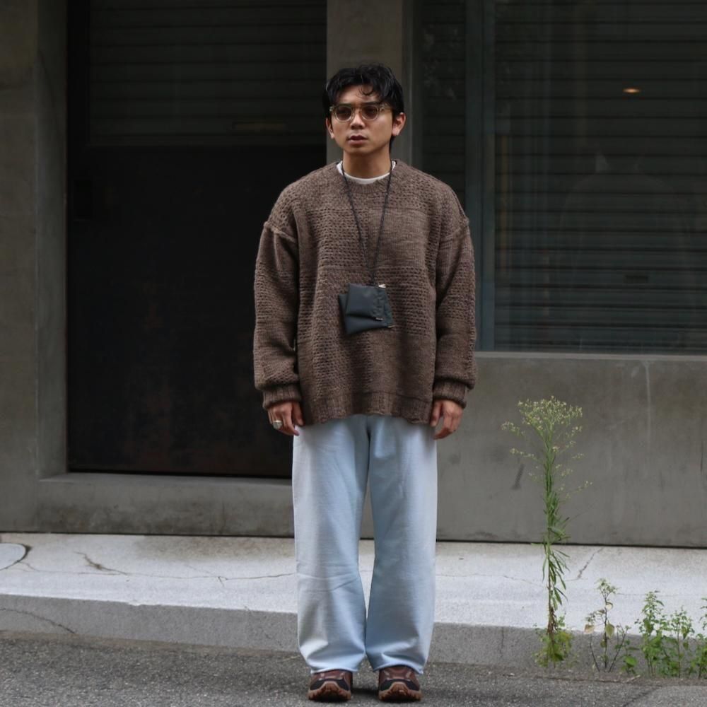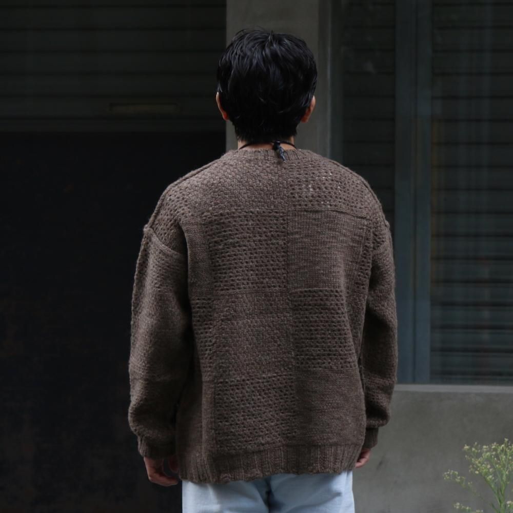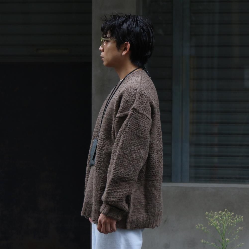 各編み地が織りなす独特のテクスチャーと、肩接ぎや袖接ぎ、脇接ぎといった接ぎ目部分をあえて表側に出しリンキングしているため、表裏ひっくり返したようなデザインになっています。袖口や裾にダメージ加工を加えることで、着古した表情のあるアイテムに仕上げられています。 素材には、ウルグアイ産の天然色の羊毛スラブヤーンを採用。染料や助剤を一切使用せず、羊毛そのもののナチュラルな色合いや風合いなど魅力を最大限に活かした素材です。