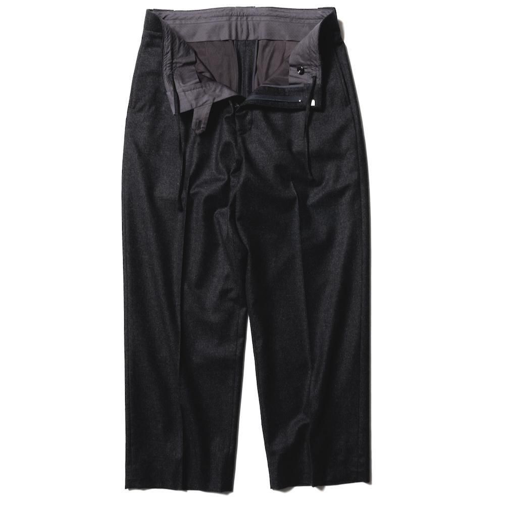 素材にはカシミアを混紡させた高密度のフランネル素材を使用。クラシックな外観ではありますが、柔らかく、肌触りの良い仕上がりとなっております。アメリカントラディショナルスタイルのプレーンフロントスラックスをベースに、1940年代のベースボールユニフォームから着想を得たベルトループを採用。ウエストにはドローコードを配し、ベルトなしでも着用できる快適な仕様に。ビジネススタイルにスポーツの機能性を融合させた、Unlikely らしいデザインのアイテムです。