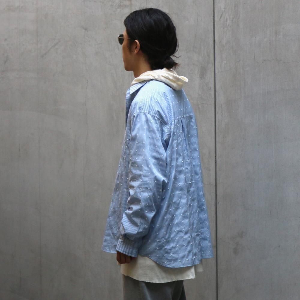 コットン100%のブロード素材を使用。全面に施された小ぶりな刺繍が特徴的。サイズはたっぷりとした身幅にスッキリとした着丈のボックスシルエット。ブランド独自のパターンメイキングや刺繍が目を惹く、今シーズンオススメのアイテムです。