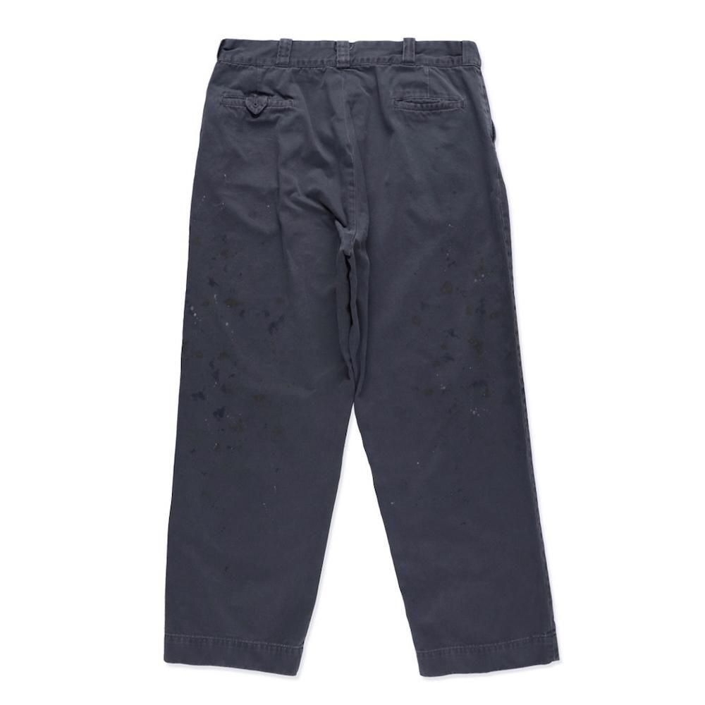 戦時下の服飾生産需要拡大により、ワークウェアブランドが急成長し、クオリティが完成期を迎えた1950年代。本作は、その時代にアメリカで24時間営業のレッカー業を営む会社の特注ワークジャケットを着想源とし、そのセットアップとして製作したワークパンツ。素材や縫製仕様はジャケットの年代と続一し、現代ではほとんど使われなくなった染料を用いた生地製作手法により、時さながらの風合いを再現しています。無骨なワークスタイルに、BOW WOWで人気を誇る沢山の染みが付き使い古した加工表現は、単品でも着こなしの軸になる一本です。