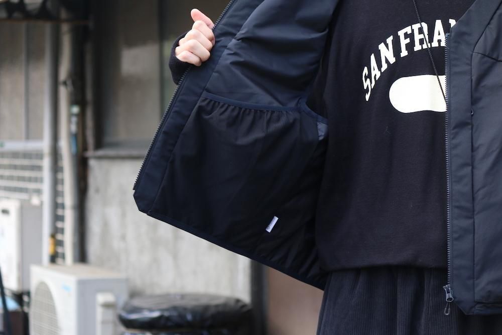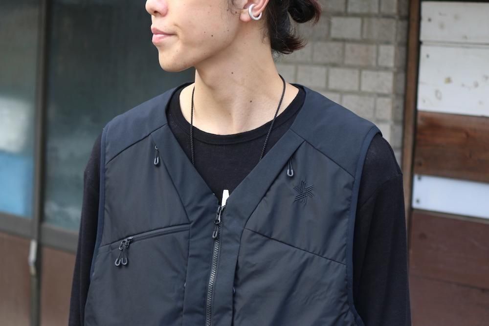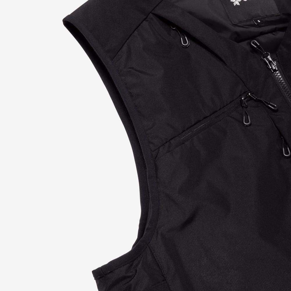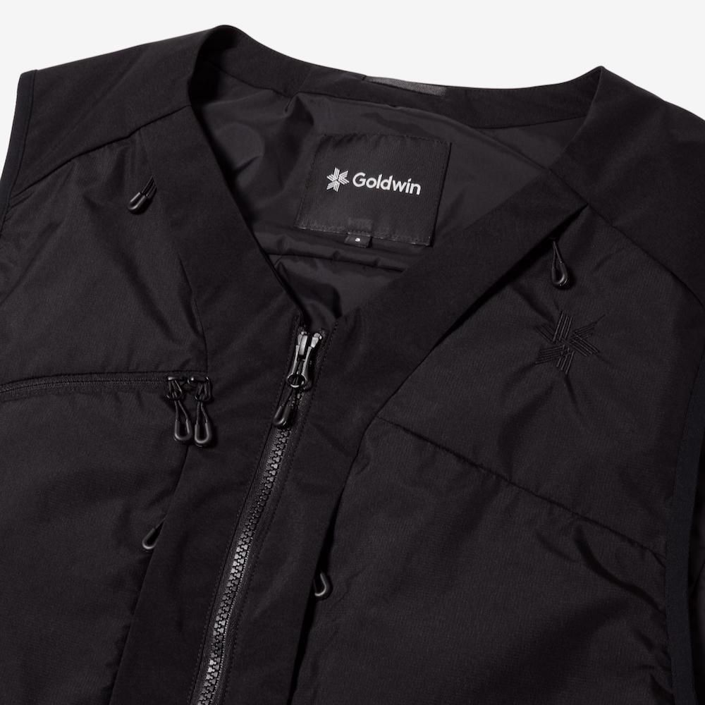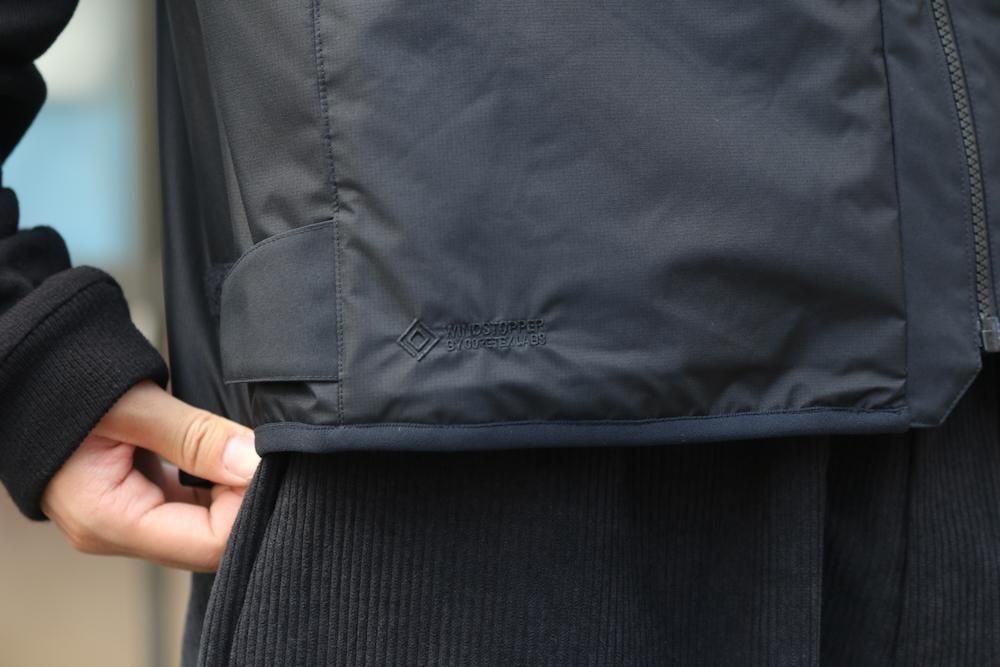 表地には防風性と透湿性をハイレベルで備えたWINDSTOPPER by GORE-TEX LABSを使用。やわらかく軽量性にも優れているため、動きやすく快適な着用感。さらに、撥水加工を施すことで多少の雨や雪への対応力も向上。裏地はスムーズな肌触りとドライ感を持続するナイロンタフタ生地を使用。中綿には湿潤時でも保温力を失いにくいポリエステル保温材を封入。水に濡れてもロフトを保ちやすく、軽量性も維持します。内側左右にメッシュポケット、背面には大型ポケットを備え、フロント側にはサングラスポケットやデジタルデバイスなどの収納に便利な多才なポケットを装備。インナーとしては勿論のこと、アウターの上からでも着用可能なゆとりのあるシルエット。両サイドにアジャスターが施されているため、フィット感の調節が可能。軽量性や柔軟性による着心地の良さと、ミニマルなデザイン、そして収納性能に優れた、さまざまなフィールドでお楽しみいただけるアイテムです。