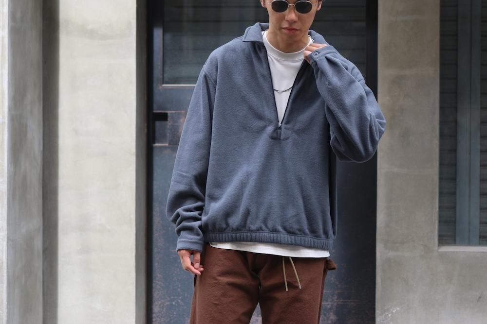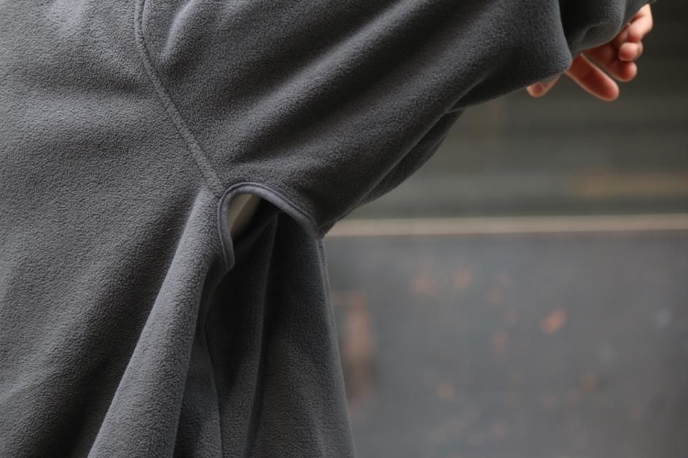 保温性に優れたマイクロフリースが使用されています。通気性を考慮しアームホールの脇はベンチレーション仕様となっています。シルエットはたっぷりとした身幅のボックスシルエット。柔らかい生地感ながらもデザインで遊び心を効かせたアイテムです。