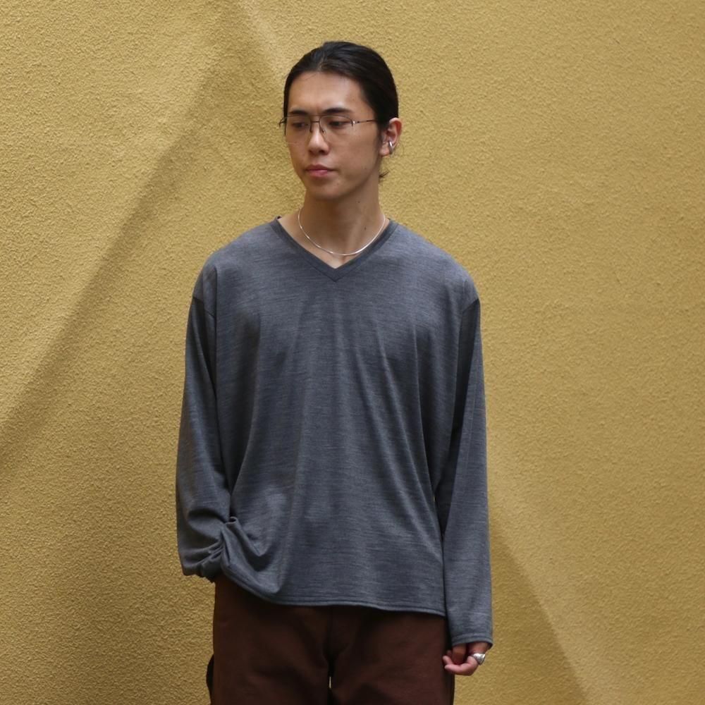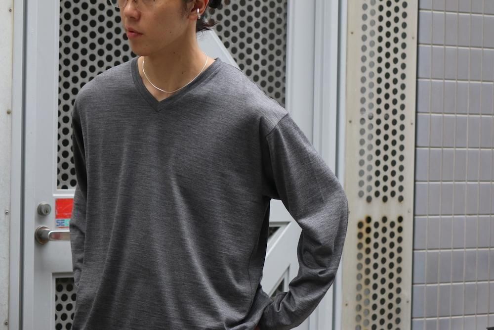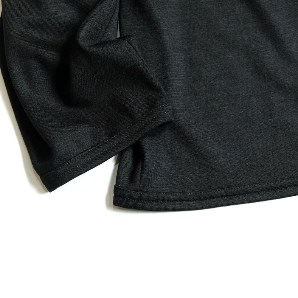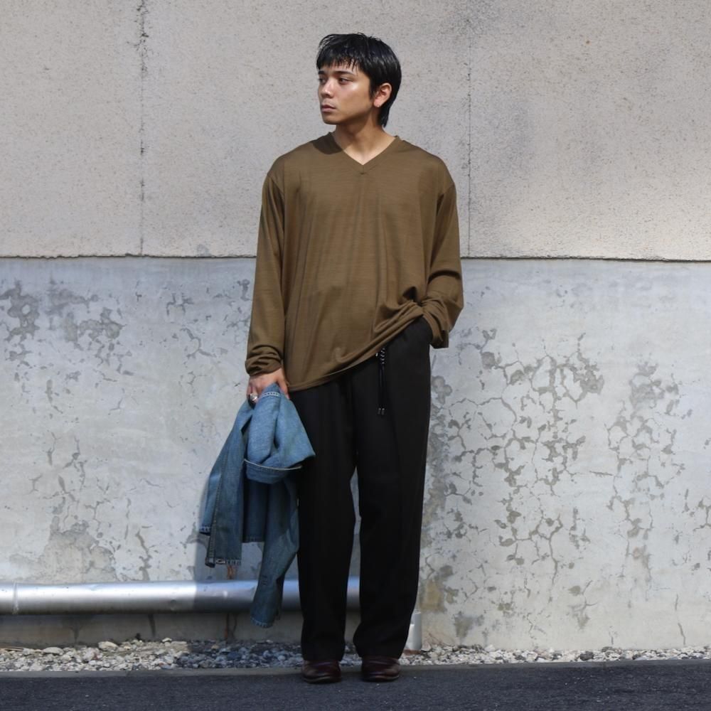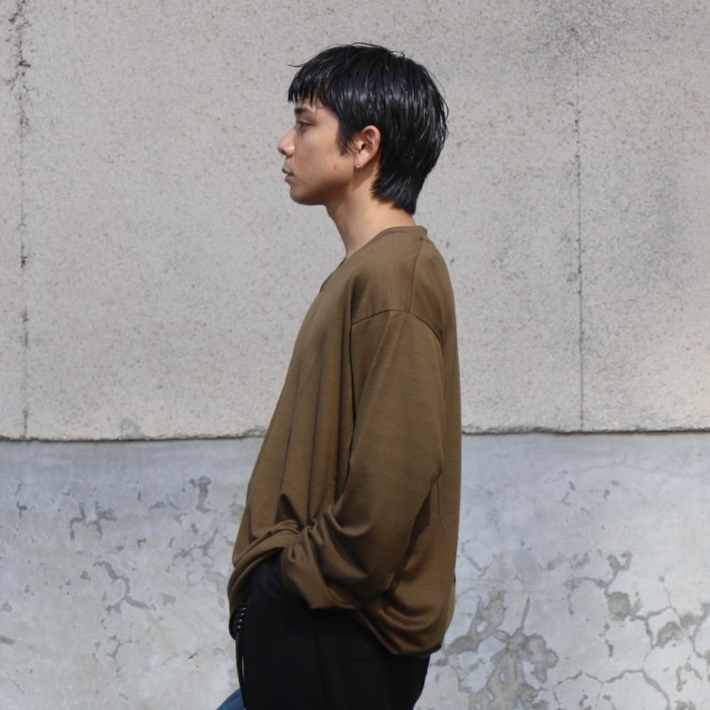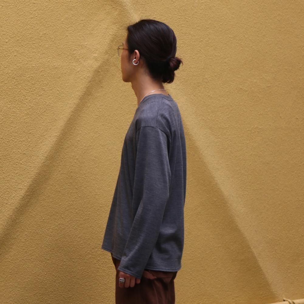 ANDERでは初めての展開となる、MERINO100%の素材は、トロッとしたウール天竺は、フルシーズン着用が可能で、更にウォッシャブル素材になります。 袖口、裾を共地パイピング使用にされていますので、リブとは違い上品な表情に仕上げられています。 着用時は、全体的にストンと落ちてくれる生地感は、カットソーとニットの間の様な素材で、1枚では勿論ですが真冬にはインナーとしても活躍してくれる、今シーズンオススメの1着です。