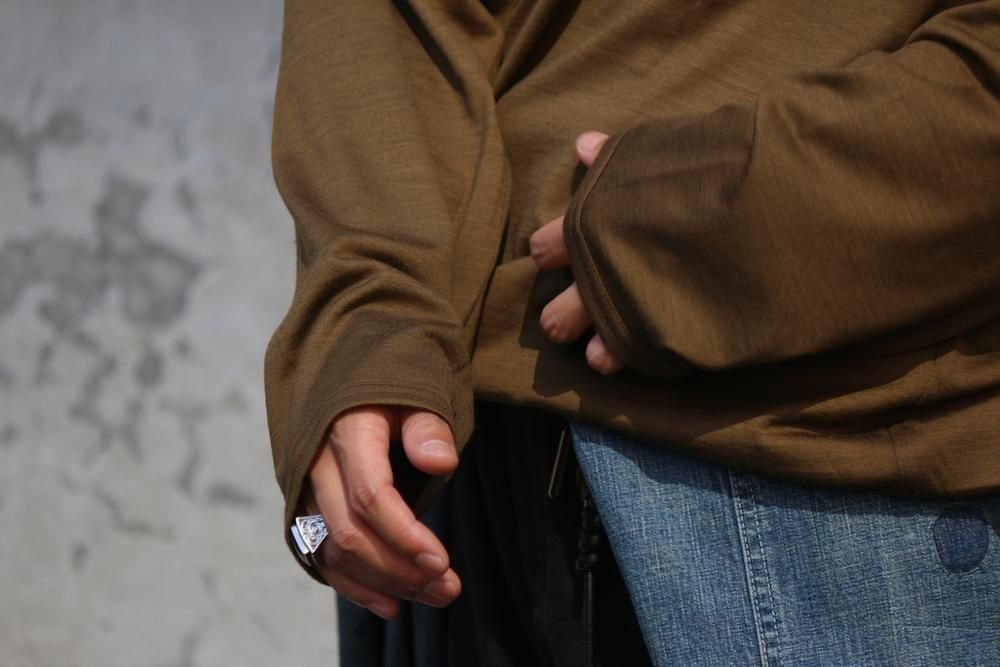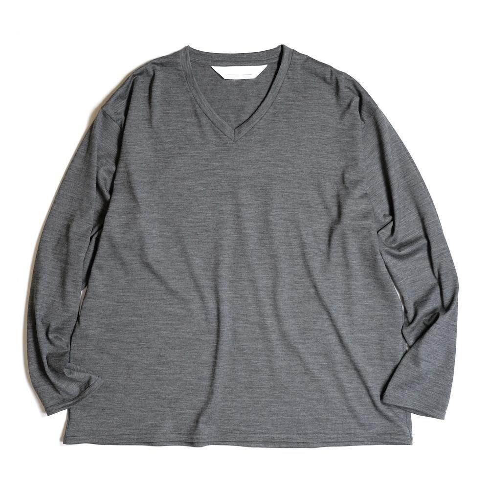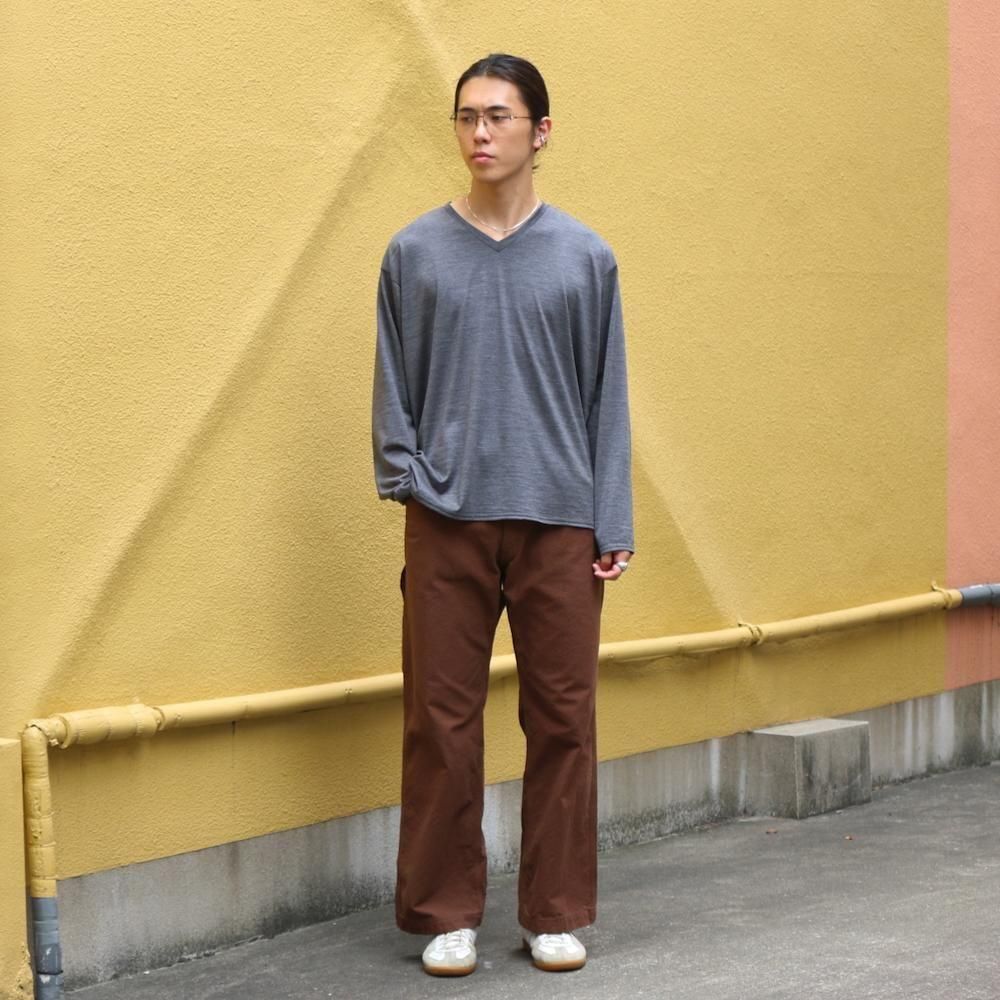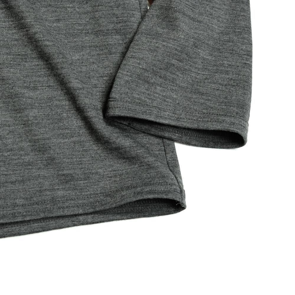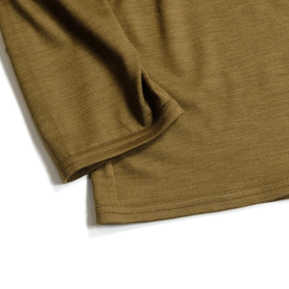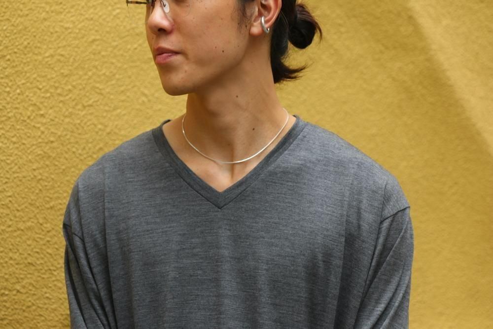 ANDERでは初めての展開となる、MERINO100%の素材は、トロッとしたウール天竺は、フルシーズン着用が可能で、更にウォッシャブル素材になります。 袖口、裾を共地パイピング使用にされていますので、リブとは違い上品な表情に仕上げられています。 着用時は、全体的にストンと落ちてくれる生地感は、カットソーとニットの間の様な素材で、1枚では勿論ですが真冬にはインナーとしても活躍してくれる、今シーズンオススメの1着です。
