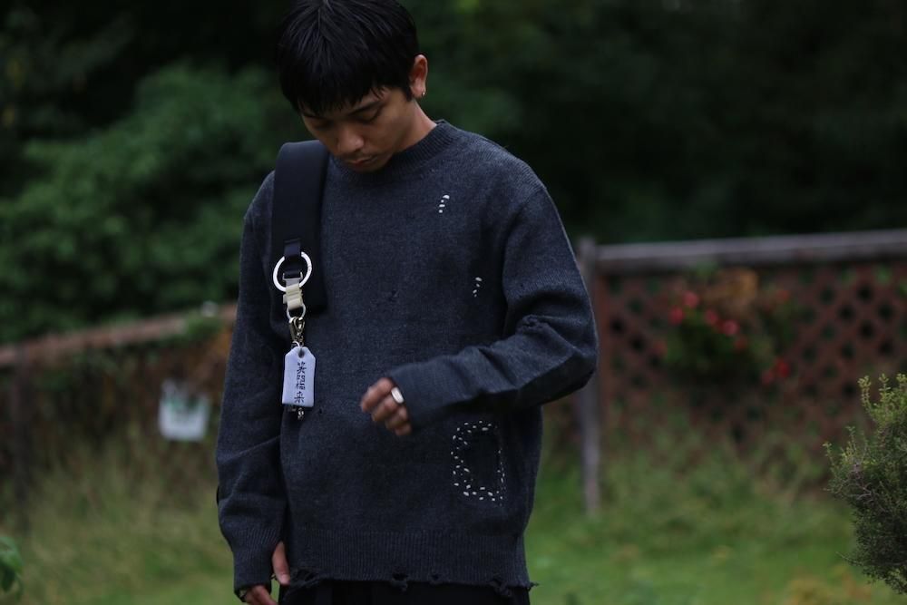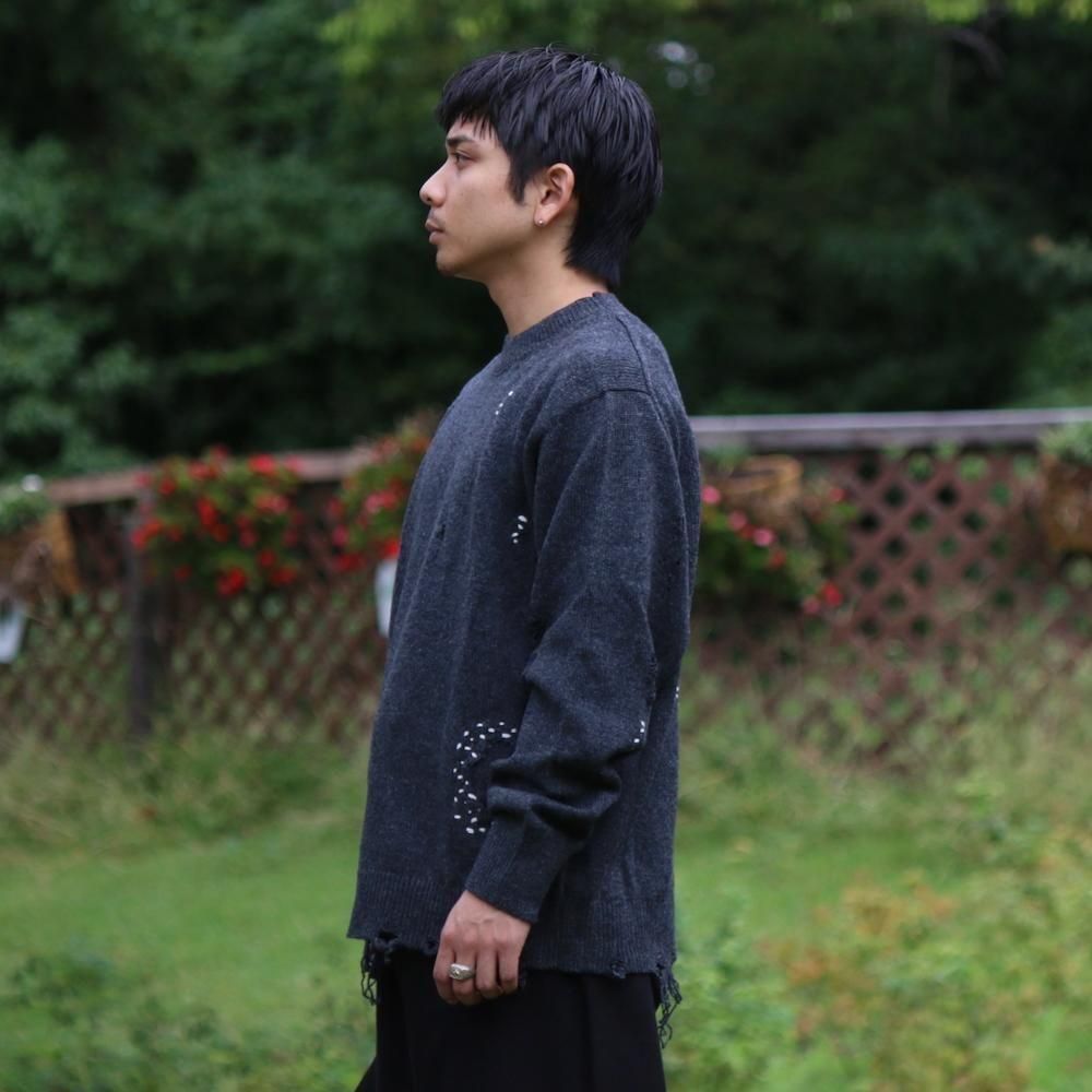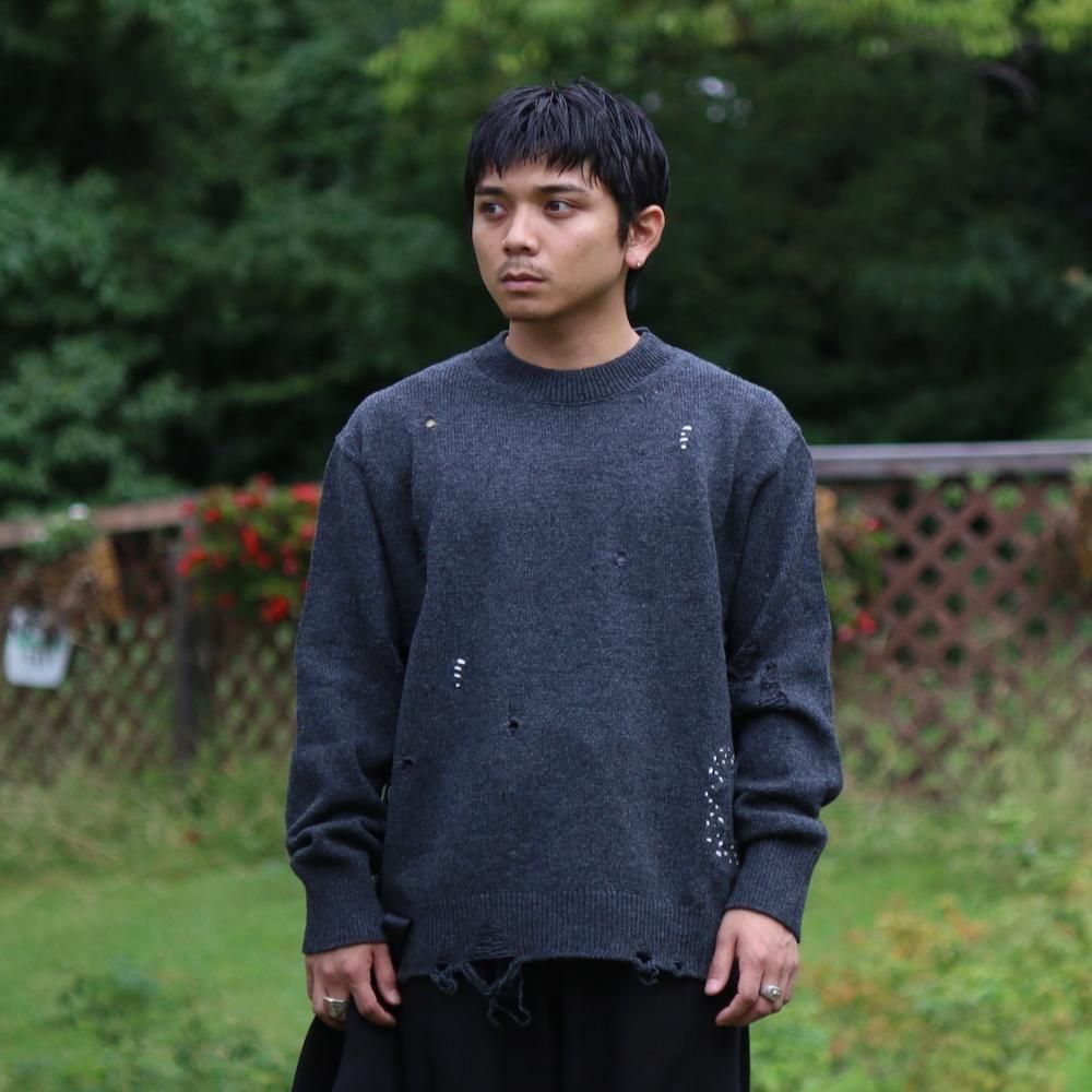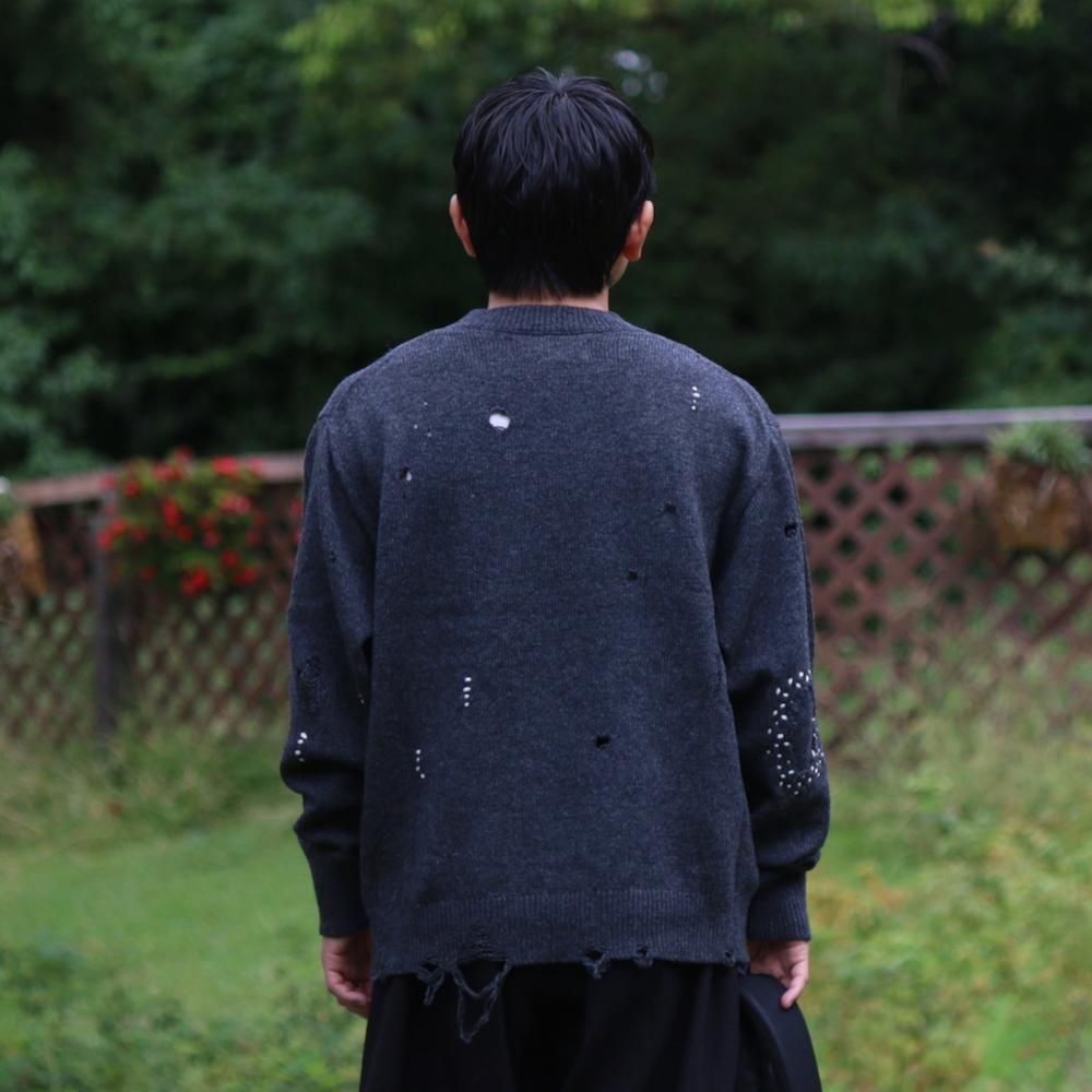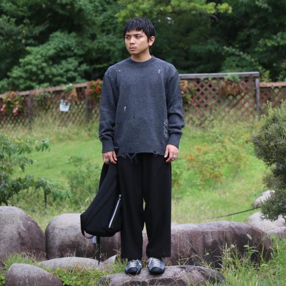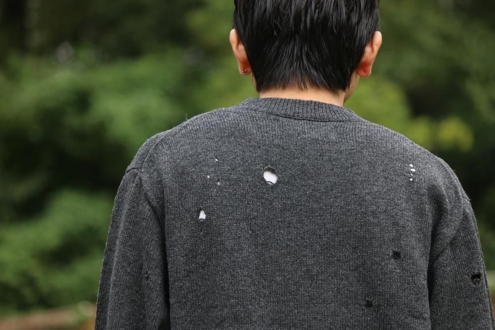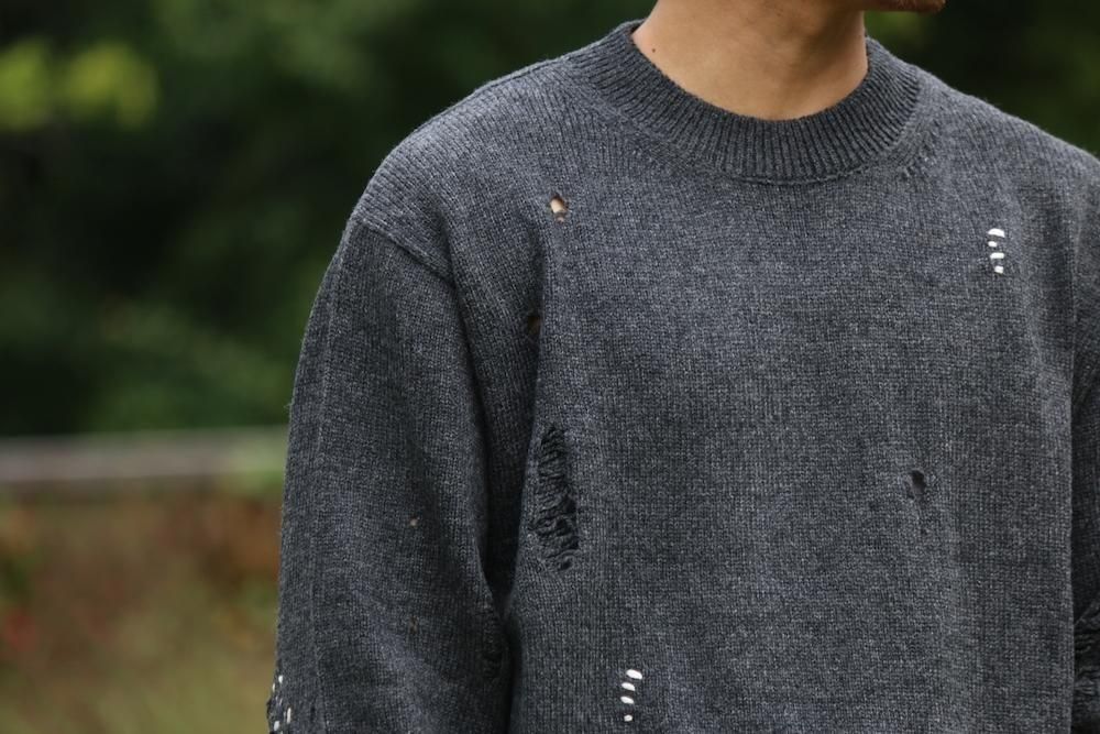 糸はオーストラリア産のメリノ種の子羊から生後6カ月以内に採取したラムズウールを原料に使用。繊維の細さは19.5ミクロンと非常に細くやわらかいウール原料をあえて太番手の甘撚りにし、膨らみのある風合いに仕上げた糸です。家庭機の7G天竺目でダメージを作りながら編みあげた後、手作業での加工、ハンドステッチリペアを加えた、味わい深い独特の表情が魅力のアイテムです。