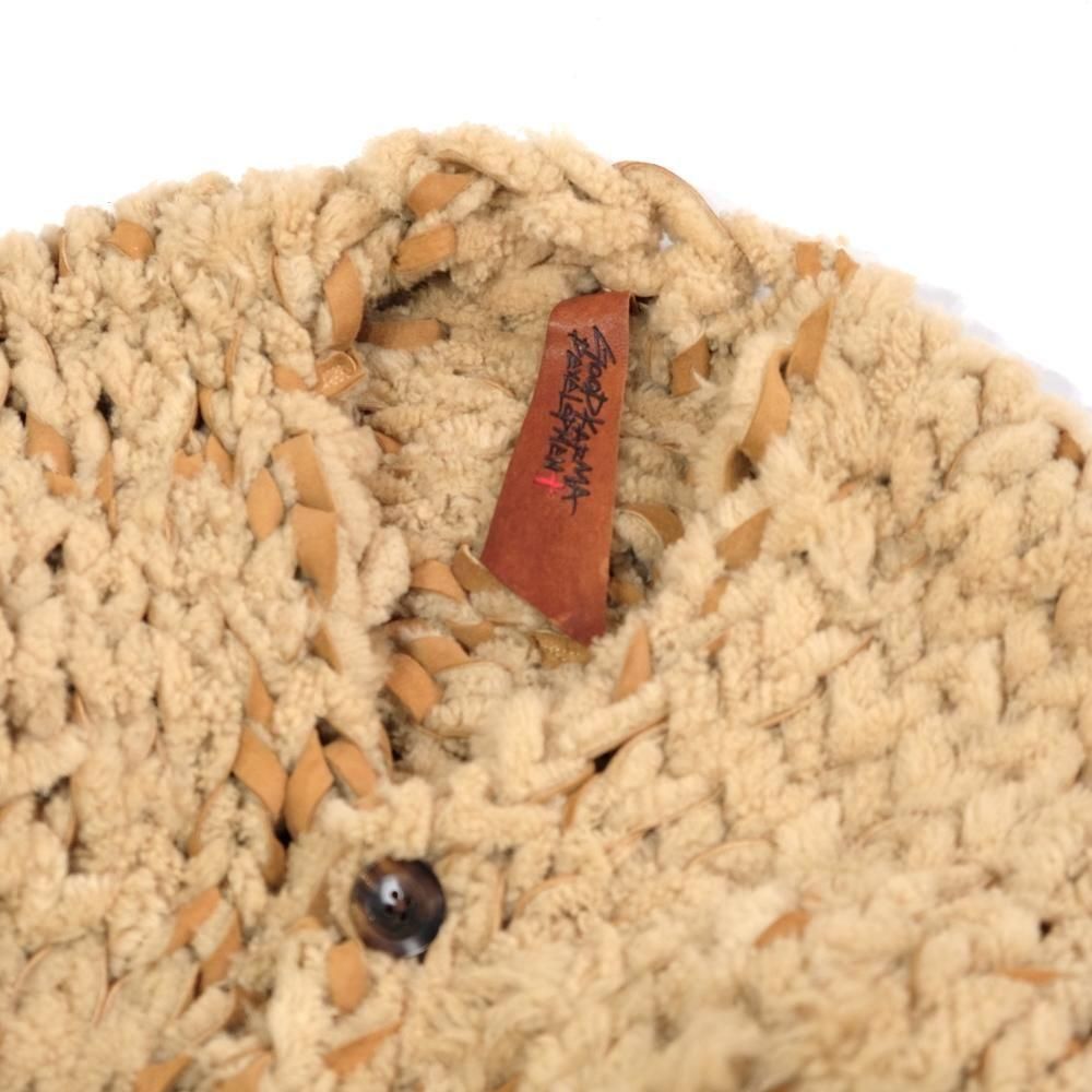 ムートンを細く裁断し、繋ぎ合わせ一本の糸にし、熟練の職人さんに手編みで一点一点丁寧に仕上げて頂きました。 表面と皮面がランダム且つ、ざっくりと編み込まれた独特の表情がおもしろい、 どれも全く同じ物が存在しない完全なる一点物になります。 ボタンにはバッファローボタンを使用し、着込む程に少しづつ伸び、本来作りたかったゆったりとしたシルエットになって参りますので、アウター感覚で着用して頂けます。 サイズはワンサイズですが、すべての工程を手作業で行っておりますので、 サイズ感は一点一点全く異なります。