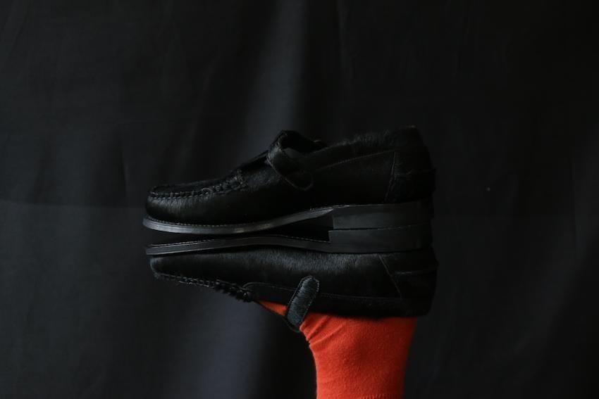 ハラコレザーを使用したTストラップローファー。