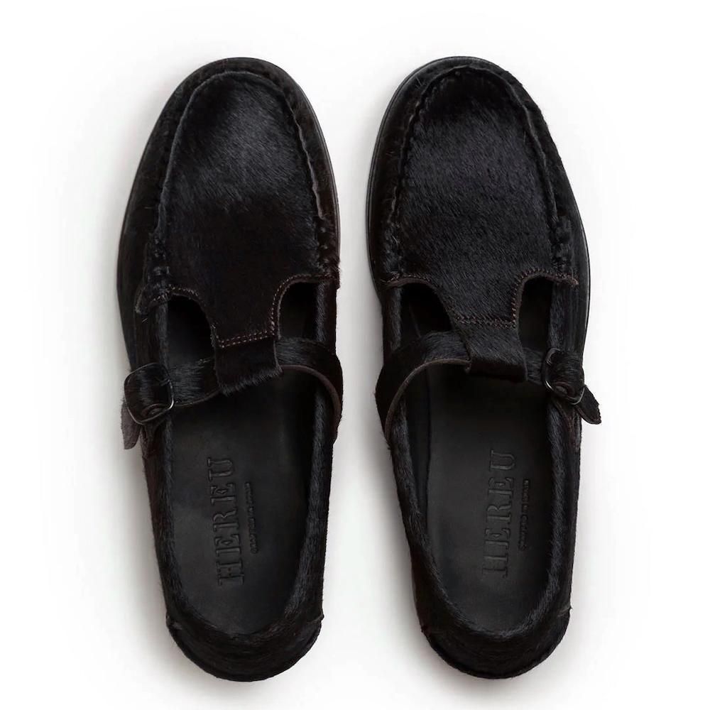 しなやか且つ耐久性にも優れたスペイン産の上質なカーフヘアを使用しており、履き初めから非常に馴染みが良く、自然で上品な光沢が特徴的。伝統的なモカシン構造を用いて、地元の卓越した技術を持つ職人によって手縫いされています。アウトソールはアッパーに縫い付けられており、耐久性と柔軟性を向上。堅牢なモカシン製法と華奢なTストラップ。本来交じり合わないモノを手仕事ならではのモノづくりで現代のライフスタイルに馴染ませ、着用を重ねるごとに愛着の湧く、私たちをワクワクさせるようなHEREUの新たな革靴の提案。革靴のハードルを下げて履き倒していただきたい、私たちの日常に寄り添う一足です。